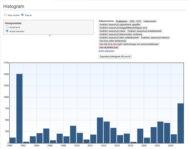 Kustpipare rastar relativt sällan och då oftast med enstaka exemplar eller små grupper. De största (minst 20 ex.) ansamlingarna av rastande under perioden 2000-2025: