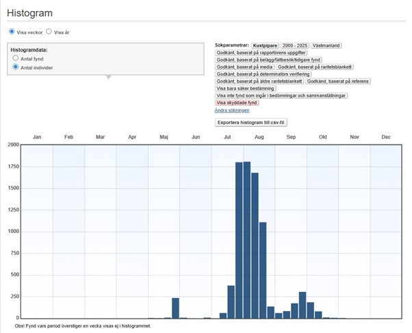 Under sydsträcket uppnås ibland sträcksummor över 100 ex. och samtliga dessa har infallit inom tidsramen 18 juli – 18 augusti. De allra högsta (minst 200 ex.) sträcksummorna under perioden 2000-2025: