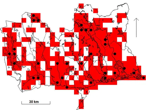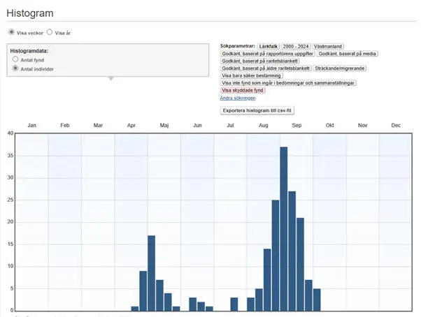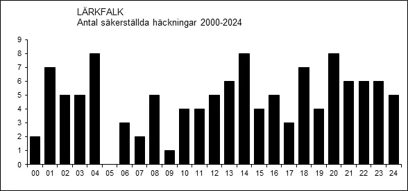 Under projektet Svensk fågelatlas 1974-1984 påträffades lärkfalken i 108 atlasrutor, dvs. mindre än hälften jämfört med det senaste decenniet. Rapporter om säkerställda häckningar visar också en svag ökning under perioden 2000-2024, även om variationerna mellan olika år är rätt stora. Sammantaget bedömer jag antalet häckande lärkfalkar i Västmanland som rätt stabilt under de senaste två decennierna.