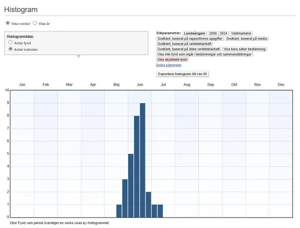 Veckovis fördelning av lundsångare under perioden 2000-2024.