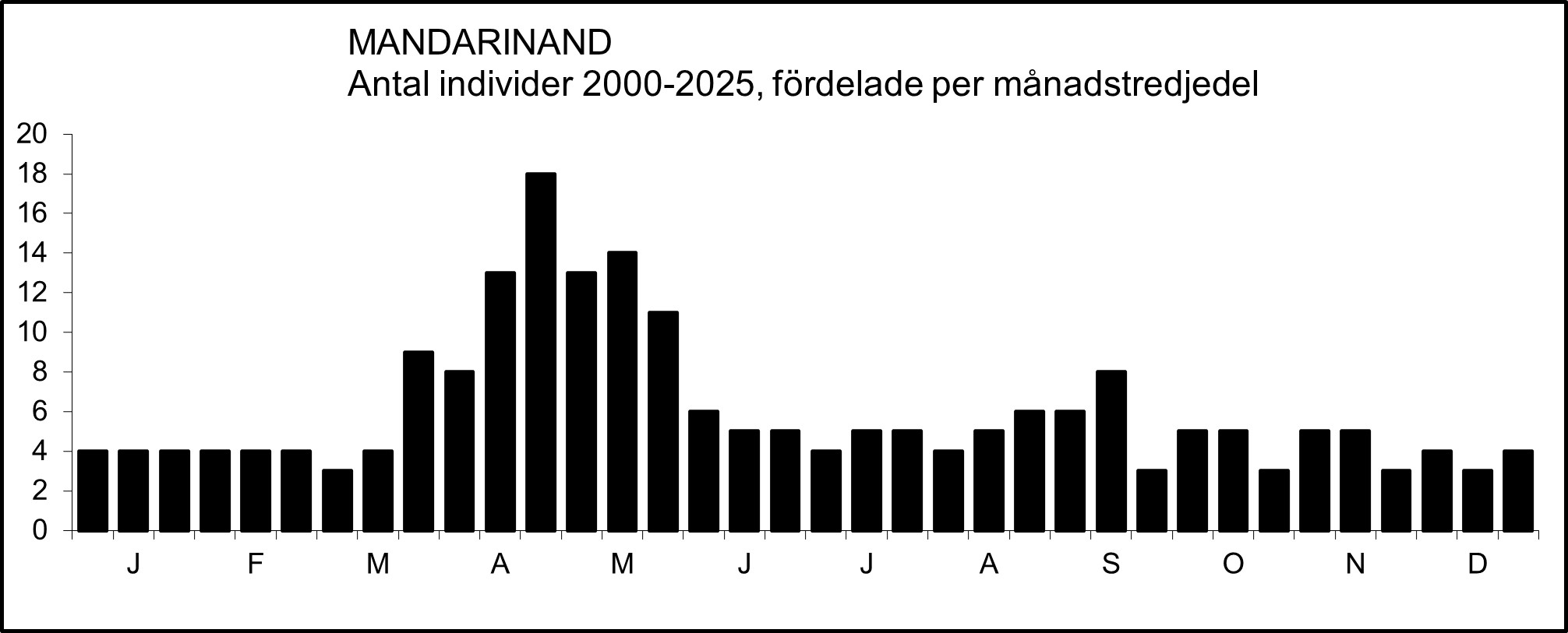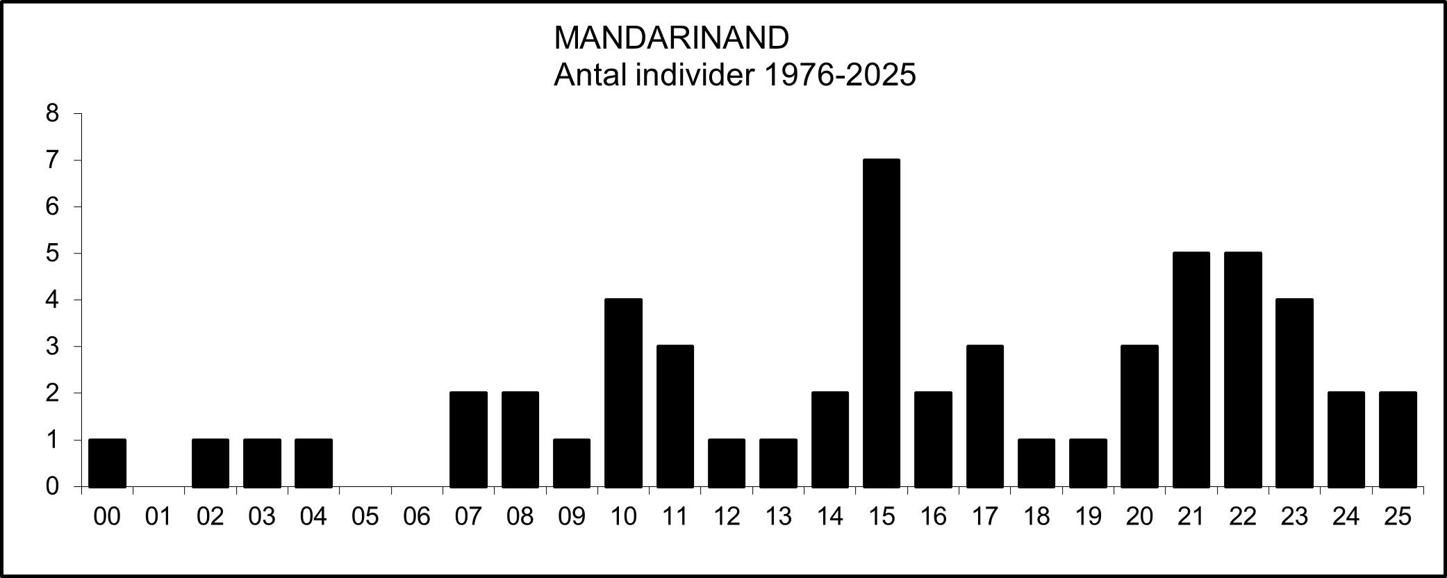 Två fynd före 1976 är kända. Det första fyndet är särskilt anmärkningsvärt, eftersom det visar att mandarinänder från den frilevande populationen på Brittiska öarna kan förflytta sig till Sverige.