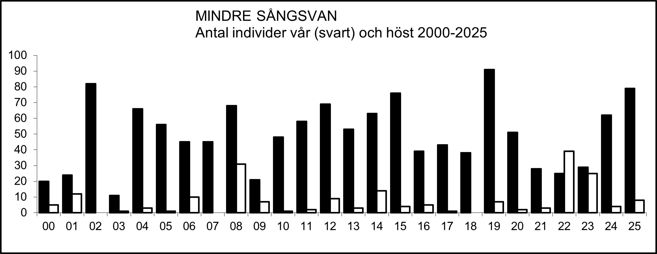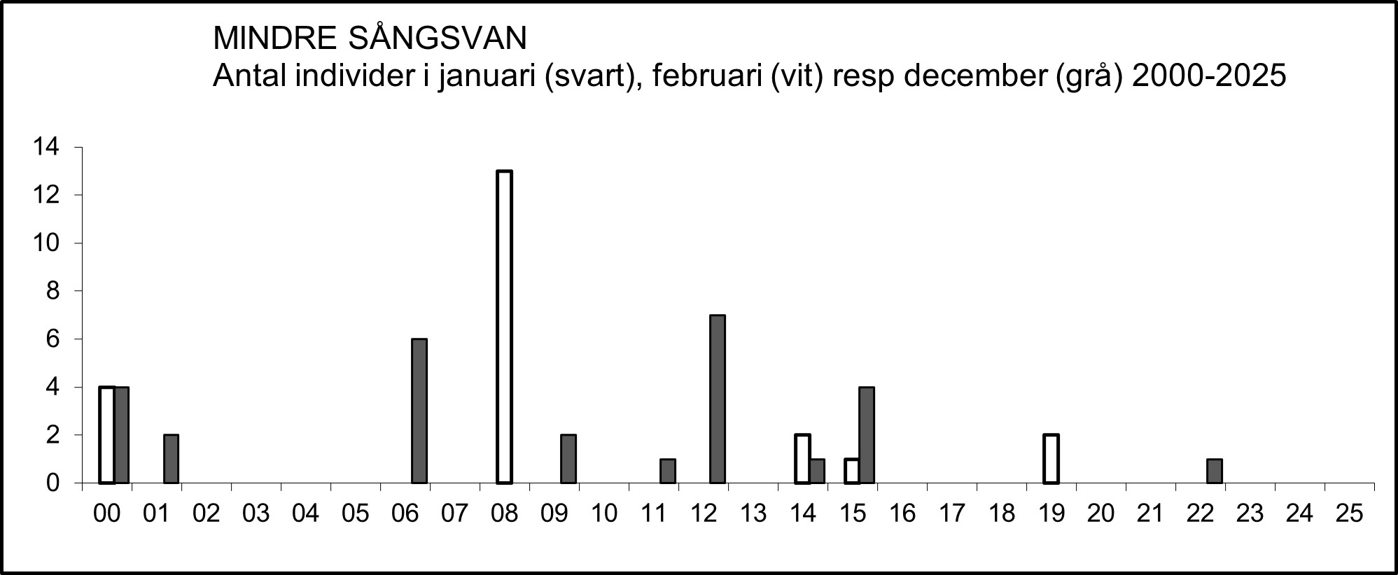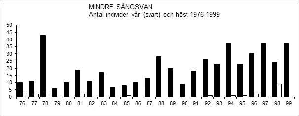 Mindre sångsvanen uppträder sparsamt men regelbundet som genomflyttare, framför allt under vårflyttningen. Antalet rapporterade individer har ökat sedan millennieskiftet och som mest rapporterades sammanlagt 91 ex. våren 2019. Höstfynd görs inte varje år men har också de ökat i antal de två senaste decennierna.