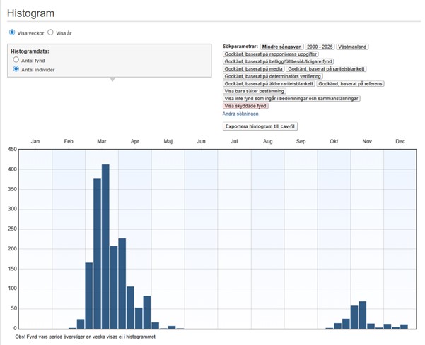 Mediandatum för första och sista vårobservation under perioden 1976-2025 är den 7 mars respektive den 23 april. Mediandatum för första och sista höstfynd under perioden 1976-2025 är den 2 november respektive den 1 december.