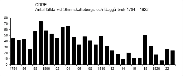 En god förekomst av orre i slutet av 1700-talet och början av 1800-talet indikeras av en jaktjournal, förd av brukspatron Wilhelm Hisinger vid Skinnskattebergs och Baggå bruk i Skinnskatteberg åren 1794-1823. Där nedlades orrar samtliga år under perioden, som mest 74 ex. år 1799 (Anonym 1908). Se histogram nedan.