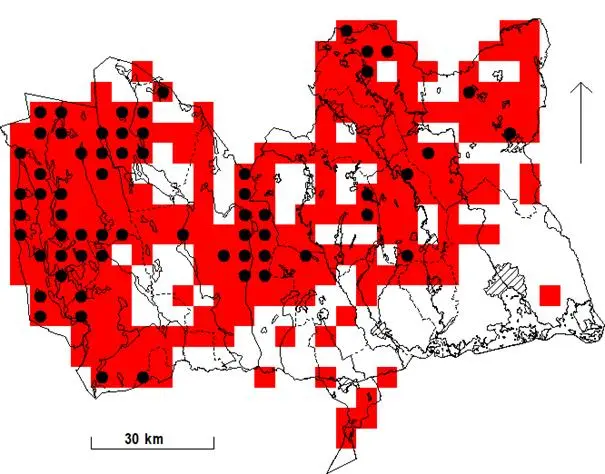 Rutor (5×5 km) med fynd av orre under häckningstid 1974-1984. Svart prick anger ruta med säkerställd häckning.