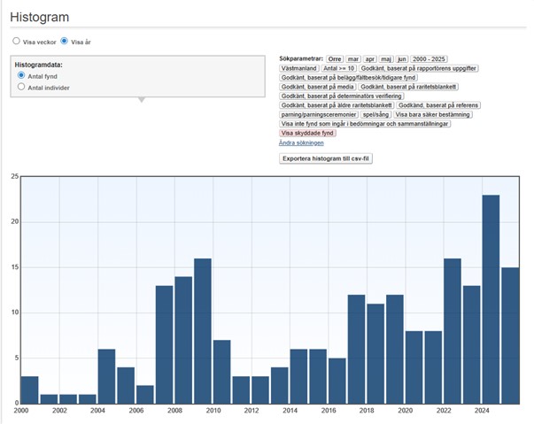 Antal rapporterade fynd av minst 10 lekande orrar 1.3-30.6, 2000-2025.