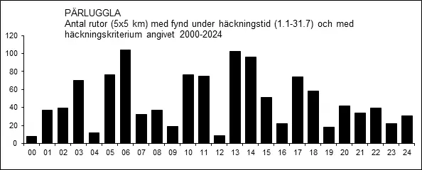 År 1969 ansågs det vara ”riklig förekomst i åtminstone Ramnäs, Västervåla, Västanfors och Norbergs socknar, troligen beroende på lokalt god gnagartillgång” (Ingvar Granqvist 1970b). År 1970 lät pärlugglan ”höra sitt revirläte första gången den 17 januari (Ingvar Granqvist)” (Anonym 1970e), men enligt Anonym (1970d) var den detta år ”inte uppe i samma antal som förra året”. Året därpå, dvs. 1971, betecknades dock som ”magert” (Anonym 1971c). År 1973 synes åter ha varit ett ”gott år” för pärluggla, åtminstone lokalt, enligt Sören Larssons (1973) beskrivning: ”Redan i slutet av januari började pärlugglor ropa i skogarna, och nästkommande två månader gav belägg för att vi hade ett gott pärluggleår i Ramnästrakten. Inom Surahammars kommungräns fanns ett 30-tal revirhållande pärlugglor, mot bara 7 st året innan”. Från landskapet som helhet rapporterades cirka 75 ropande pärlugglor år 1973 (Lars Lindell 1974f).