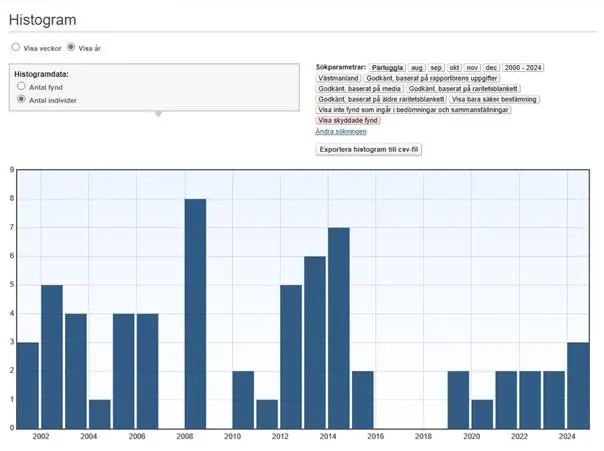 1975 ”1 ex sågs vid ’Rastholmen’ [Västerås-Barkarö] 10.3 (Lars Lindell m.fl.)” (Thomas Skoglund 1976).