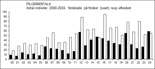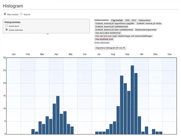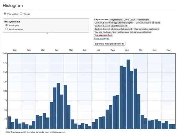 Pilgrimsfalkens höststräck är utdraget från slutet av augusti till mitten av oktober, men kulminerar i mitten eller slutet av september. Vårsträcket är i huvudsak koncentrerat till april och början av maj. Vinterfynd är ovanligt, men har ökat påtagligt sedan 2012 och ökningen kan ha ett samband med ovannämnda utsättningar och häckningar i Västerås och Köping.