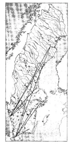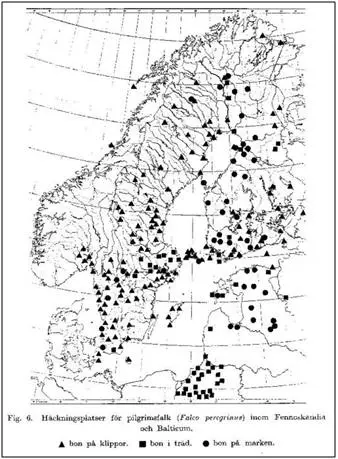 Även Thorwald Lindquist (1947) visar en karta med tre markeringar i Västmanland, som anger ”plats för ett eller flera närliggande pilgrimsfalkbon”. Markeringarnas läge stämmer dock inte särskilt väl med nyssnämnda redovisning av Thomasson.