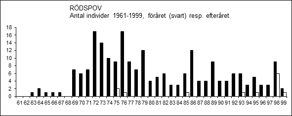De största ansamlingarna med rödspovar under perioden 1976-1999 är 4 ex. vid Fläcksjön den 25 april 1976 (MVOF 8:77) och 6 ex. vid Gnien i Ramnäs den 17 juli 1998 (FiV 30[2]:38).