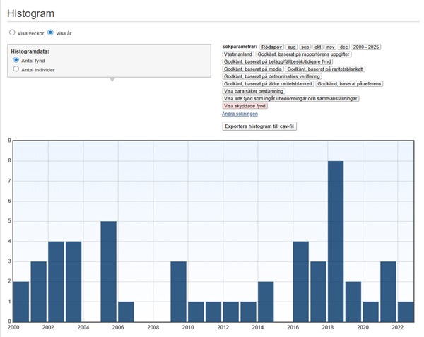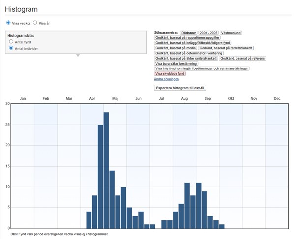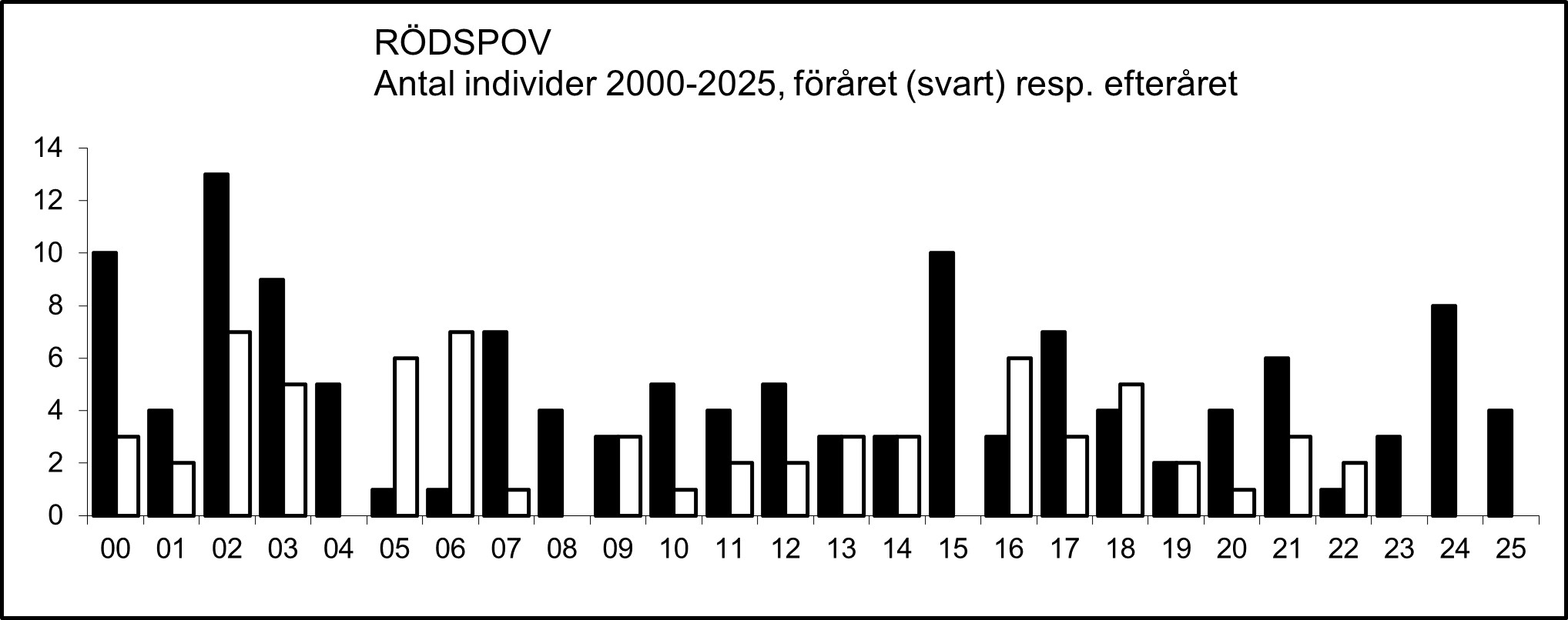 Den största ansamlingen med rödspovar som setts i landskapet under perioden 2000-2025 är 6 1K vid Asköviken i Västerås-Barkarö 21-25 augusti 2002 (FiV 34:106).