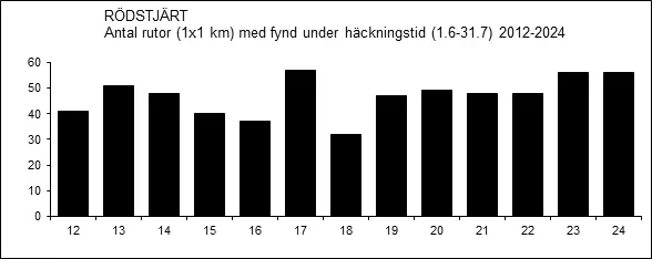 I Hallstahammars tätort i Svedvi, cirka 9 km² totalarea, fanns 10 sjungande hannar år 2000, vilket motsvarar en täthet av 1,1 par/km² (Sören Larsson & Kjell-Åke Källebrink 2001). I Fagersta tätort i Västanfors fanns 10 revir år 2001, motsvarande 0,7 par/km² (Sören Larsson & Kjell-Åke Källebrink 2002). I ett område med uppsatta holkar på den så kallade Hälleskogsbrännan i Ramnäs m.fl. socknar, fanns år 2018 häckande rödstjärtar med en täthet av 4,7 par/km² (Sören Larsson & Erik Westman 2019).