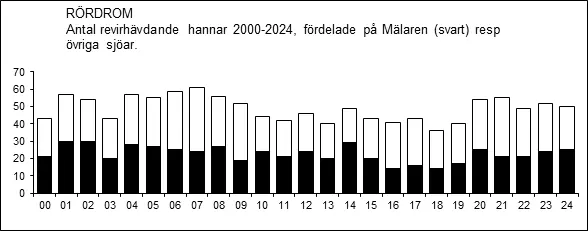 Antalet revirhävdande rördrommar har under perioden 2000-2024 varierat från som lägst 36 år 2018, till som mest 61 år 2007. Totalt sett synes ingen tydlig tendens föreligga. Beståndet är dock känsligt för stränga vintrar och kraftiga nedgångar har då registrerats. Beståndet i västmanlandsdelen av Västmanlands län beräknades i mitten av 1980-talet till cirka 28 par (Thomas Skoglund 1985, s. 24). En aktuell medelsiffra för 2000-talet är förslagsvis 50 hannar. Ulf Ottosson m.fl. (2012) har beräknat antalet till 60.