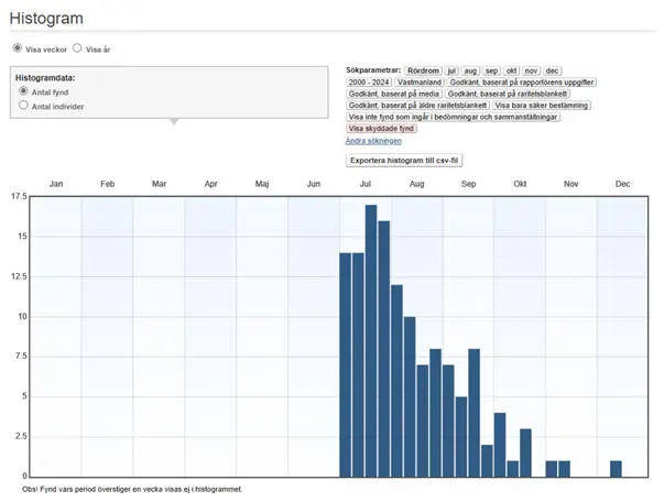 Ett januarifynd är känt under perioden 2000-2024, kanske snarast att betrakta som ett extremt sent höstfynd:
