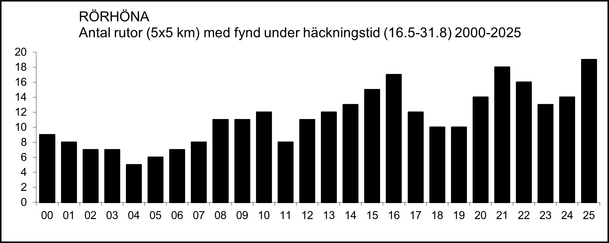 1974 ”5 revir. Arten visade sig vara mycket svår att inventera p.g.a. sitt tysta och undangömda levnadssätt. Troligen är det verkliga antalet revir betydligt större än vad inventeringen visar. Samtliga påträffade revir befanns ligga i bladvassområdets ytterkanter. Revirtätheten på hela sjöytan blir 13 par per kv.km. (Även vid rörhöneinventeringarna användes en bandspelare som hjälpmedel) [Frövisjön i Skultuna].” (Claes Karlsson & Sören Larsson 1976).