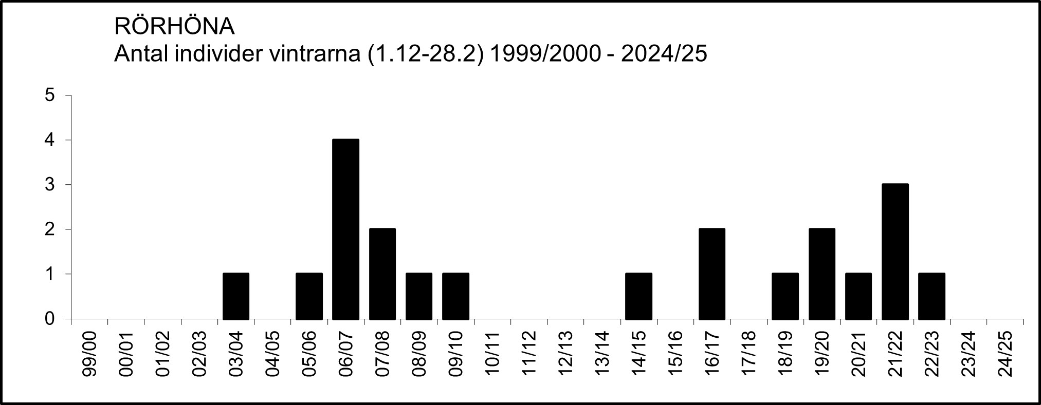 1975/76 ”Under hela perioden [dec. 1975 – feb. 1976] har en rörhöna funnits i Sagån, Sala, och 1 ex fanns i Västerås hamn under december-januari.” (Lars Lindell 1976c). ”Ett ex. Västerås hamn och Sagån, Sala i dec (Karl-Gunnar Källebrink, Lars Lindell m. fl.).” (Lars Lindell 1976d).