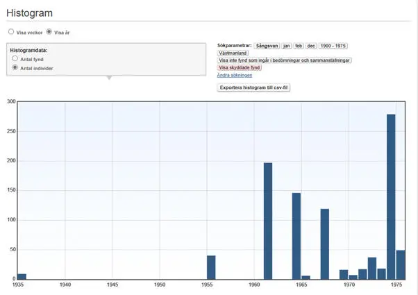 Antalet vinterfynd (1.12-28.2) ökade successivt under 1960-talet och registrerades årligen från och med 1970-talet, se figur nedan.