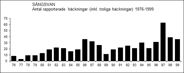 1965-69 ”Artens häckning i Västmanland gav 1969 2 ungar, 1967 4 ungar [Hultasjön i Lindes]. Sångsvanens häckning i landskapet sträcker sig minst 10 år tillbaka i tiden (Ola Almkvist). Häckade troligen även i år i samma sjö som i fjol, då 1 par med minst 3 ungar iakttogs av Bertil Forsberg och Sven-Olov Selim 15.6.68, och där 1 par upptäcktes redan 29.5.65, då den ena låg på bo. Våren var sen 1969 och redan i första öppna vaken låg svanparet. Flyttande svanar rastar sällan i sjön. I solnedgången 8.6 låg en ensam svan i vaktposition mitt ute på den spegelblanka sjön. Ruvningen var troligen ej avslutad. Tyvärr besöktes ej sjön senare. Unga grå svanar och även någon äldre vit kan man numera få se på flera lokaler under senvåren och sommaren, varför ytterligare häckningar möjligen förekommer eller troligen är att vänta (Bertil Forsberg).” (Ingvar Granqvist 1970b).