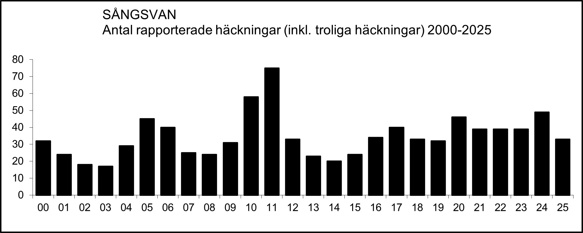 Inventeringsresultat från perioden 2000-2025 saknas, men som mest rapporterades spontant 75 häckningar år 2011 (FiV 43[2-3]:18).