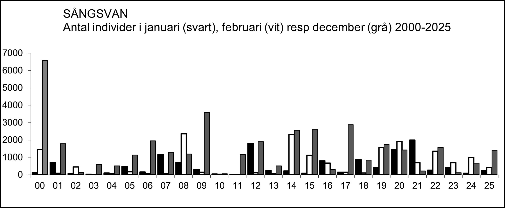 De högsta (minst 1 000 ex.) dagssummorna av sträckande sångsvanar 2000-2024: