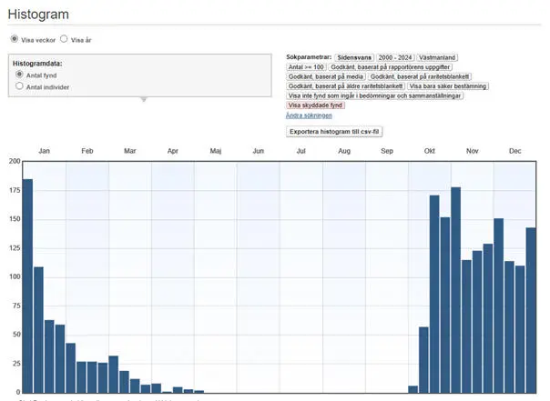 På hösten anländer de första sidensvansarna i regel i början av oktober. Mediandatum för första höstfynd under perioden 1976-2017 är den 7 oktober. De första sidensvansarna tenderar att anlända allt tidigare på hösten, ofta redan i september. Det allra tidigaste höstfyndet gjordes vid Frövi i Näsby den 1 september 2011 (FiV 43[2-3]:47). Uppträdandet kulminerar i regel runt månadsskiftet december/januari. Den höga stapeln i första januariveckan i figuren nedan är troligen en artefakt, betingad av s.k. ”årskryssande”. Antalet sidensvansar minskar snabbt efter mitten av januari, sannolikt en effekt av att tillgången på föda tryter. I figuren nedan kan en liten topp skönjas i mars, sannolikt gällande retursträckande fåglar. Under april försvinner de flesta av sidensvansarna och de sista fåglarna ses ofta några dagar in i maj. Mediandatum för sista vårfynd under perioden 1976-2017 är den 4 maj. Det allra senaste vårfyndet gjordes vid Asköviken i Västerås-Barkarö den 31 maj 2003 (Mats Westberg m.fl., opubl.).