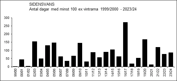 Vissa vintrar registreras höga koncentrationer av sidensvansar. De största (minst 2 000 ex.) ansamlingarna under perioden 2000-2024: