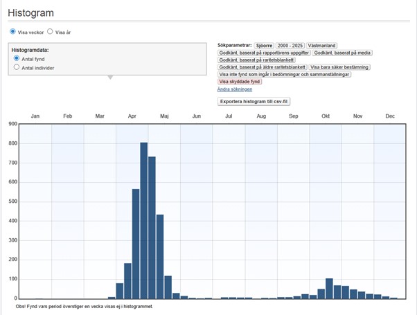 Mediandatum för första och sista vårobservation under perioden 1976-2025 är den 11 april respektive den 28 maj. Mediandatum för första och sista höstfynd under samma period är den 16 augusti respektive den 22 november. Förutom att de första fynden för året har gjorts allt tidigare, se tabell nedan, kan man lägga märke till att höstflyttningen blivit mer utdragen. Mediandatum för första höstobservation har tidigarelagts med två månader och mediandatum för sista höstfynd har senarelagts med cirka en månad.