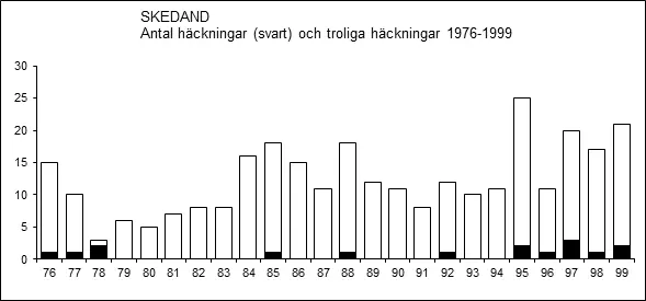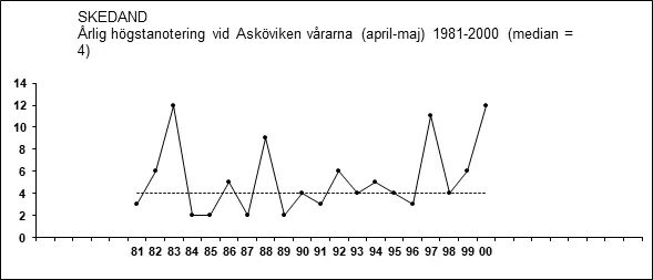 Vårarna 1981-2000 räknades skedänder vid Asköviken nästan dagligen och där var en positiv tendens rätt tydlig, om än inte statistiskt säkerställd (rs = +0,302).