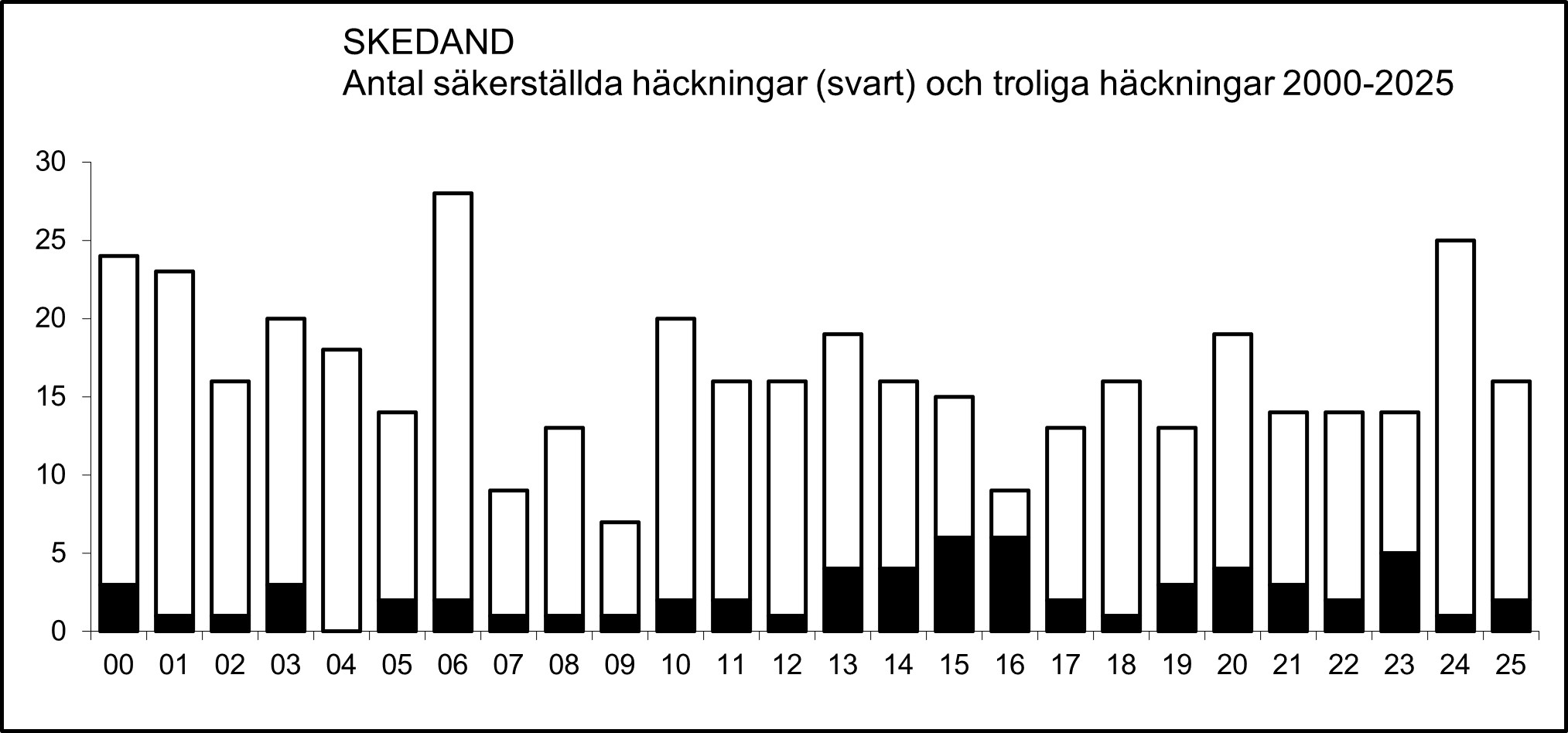Sammanlagt har skedanden påträffats under häckningstid (21 maj – 31 juli) på cirka 55 lokaler i landskapet. På några lokaler förekommer fler än ett par, på andra är förekomsten troligen inte regelbunden. Skedanden synes klart talrikare än årtan Spatula querquedula, vars population uppskattats till cirka 10 par. Ulf Ottosson m.fl. (2025) har beräknat beståndet till 60 par, en siffra som jag ansluter mig till.