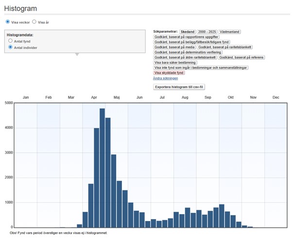 2025 25 (15 ♂♂, 10 ♀♀) r. Hogglumbacken i Västerfärnebo 17.4 (Västmanlands rapportkommitté).