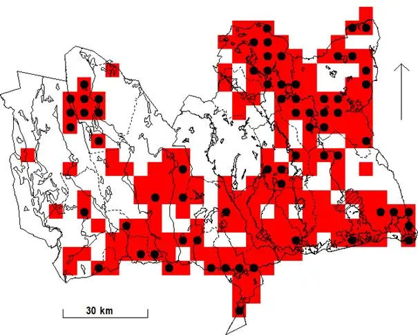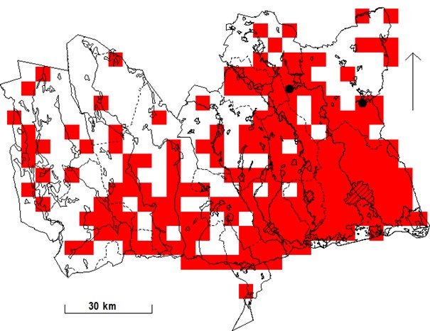 I utbredningskartan nedan, avseende perioden 1974-1984, uppgifter hämtade från projektet Svensk fågelatlas, finns en till synes märklig koncentration av säkerställda häckningar i Ljusnarsberg och angränsande delar av Hällefors. Om dessa uppgifter är riktiga indikerar det en dramatisk nedgång i beståndet där under senare decennier.