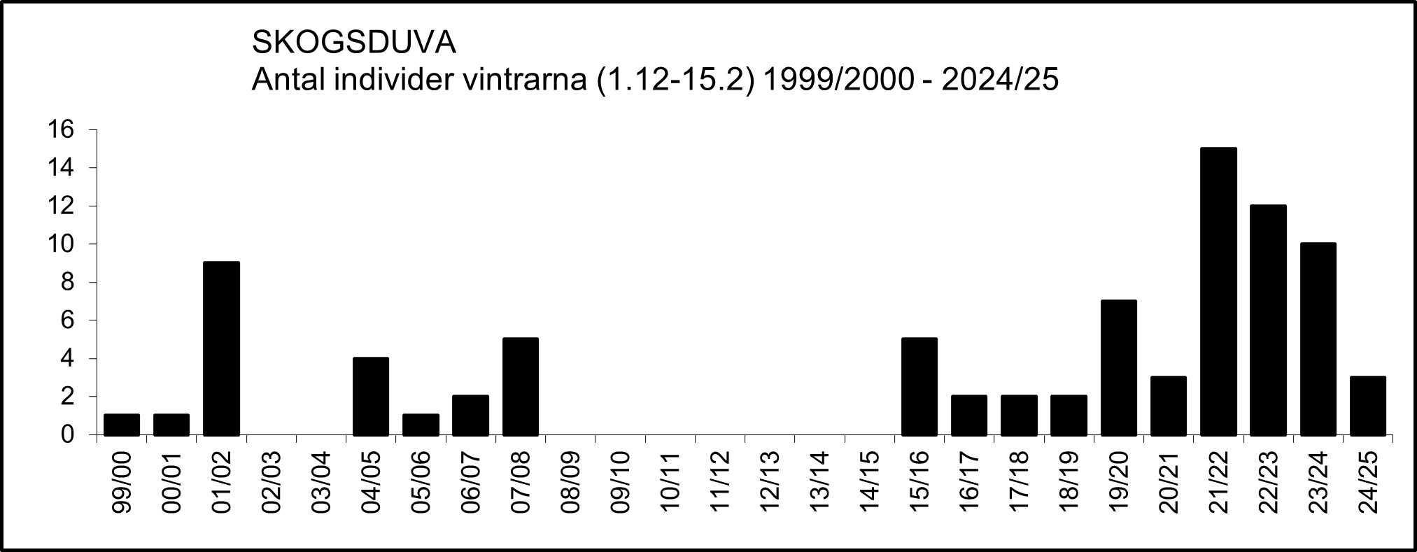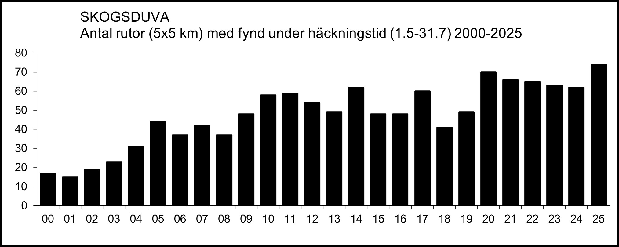 Huruvida beståndet av skogsduva har genomgått någon större förändring i numerär under de senaste decennierna är oklart. I figuren nedan visas antalet rutor (5×5 km) per år med fynd av skogsduva under häckningstid (1.5-31.7). Dessa data indikerar dock att det inte tycks ha skett någon större förändring av numerären åtminstone de senaste 10-15 åren. De förhållandevis låga antalen åren närmast efter millennieskiftet är med största sannolikhet missvisande och beror på underrapportering.