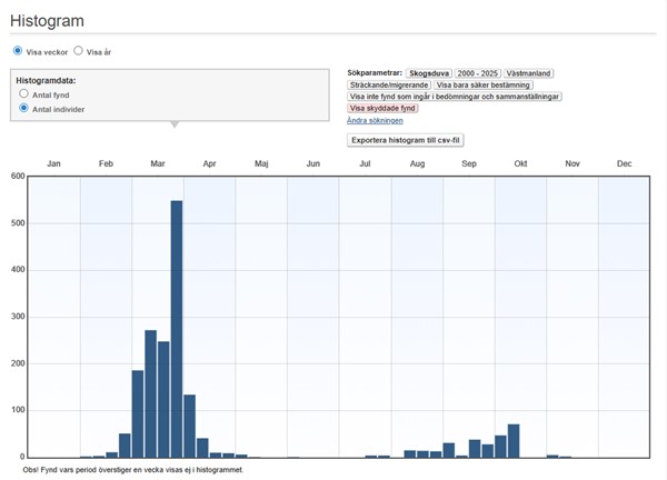 Skogsduvan flyttar från slutet av augusti till början av oktober och återvänder i slutet av februari eller början av mars. Mediandatum för första och sista fynd under perioden 1976-2025 är den 2 mars respektive den 11 november.