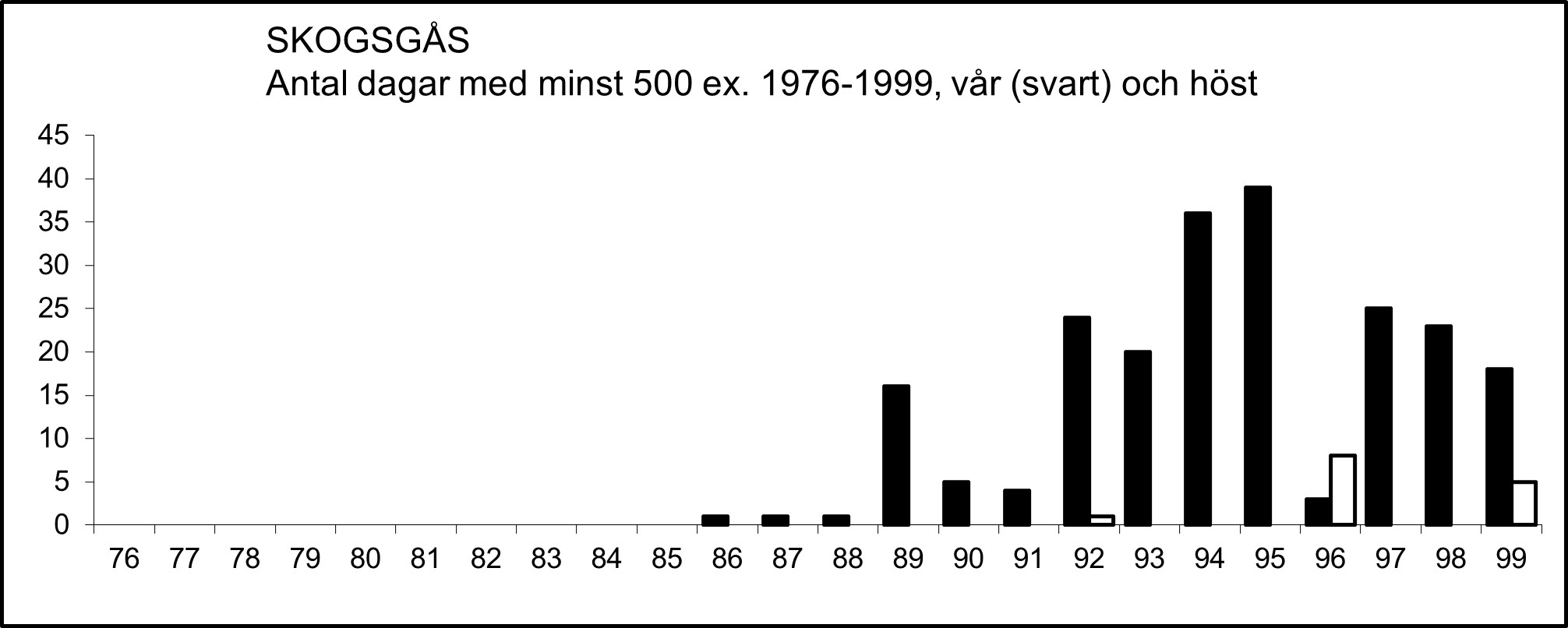 Höst- och vårflyttande skogsgäss i Västmanland är således en företeelse som torde ha minst några hundra år på nacken. Per Olsson (1974) sammanställde uppgifter om sträckande skogsgäss i Västmanland under åren 1970-1974 och drog bland annat följande slutsatser: sträckriktningen är utpräglat nordnordostlig, sträcket kulminerar sista aprilveckan eller första dagarna i maj samt att minst 1 000 skogsgäss passerar Västmanland varje vår. Högre (minst 500 ex.) dagssummor före 1976: