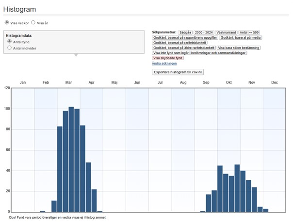 | första vårobservation (minst 50 ex) | sista vårobservation (minst 50 ex) | första höstobservation (minst 50 ex) | sista höstobservation (minst 50 ex) | |