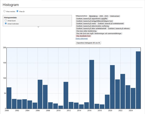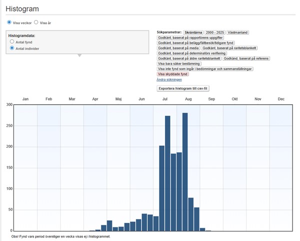 De största (minst 50 ex.) ansamlingarna under perioden 2000-2025 inföll samtliga under perioden 23 juli – 10 augusti: