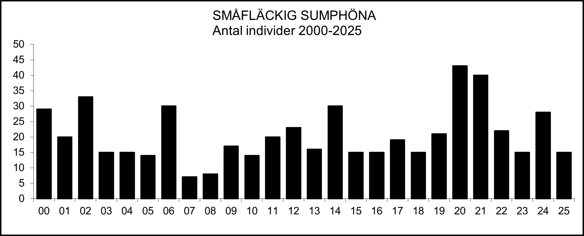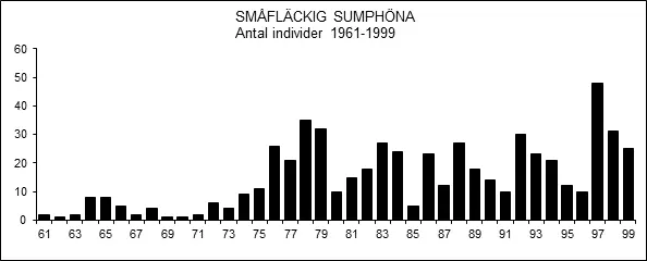 På våren brukar de första småfläckiga sumphönsen höras i slutet av april eller början av maj. Mediandatum för första observation vårarna 2000-2025 är den 23 april. Ytterlighetsdatum i sammanhanget är 4 april resp. 12 maj.