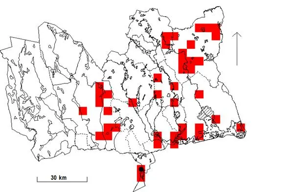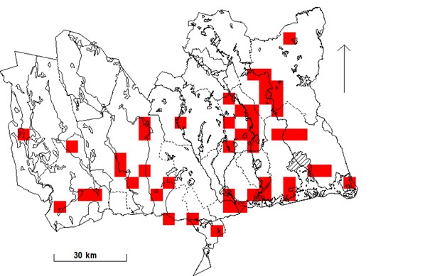 Rutor (5×5 km) med fynd under häckningstid 1974-1984. Svart prick anger ruta med säkerställd häckning.