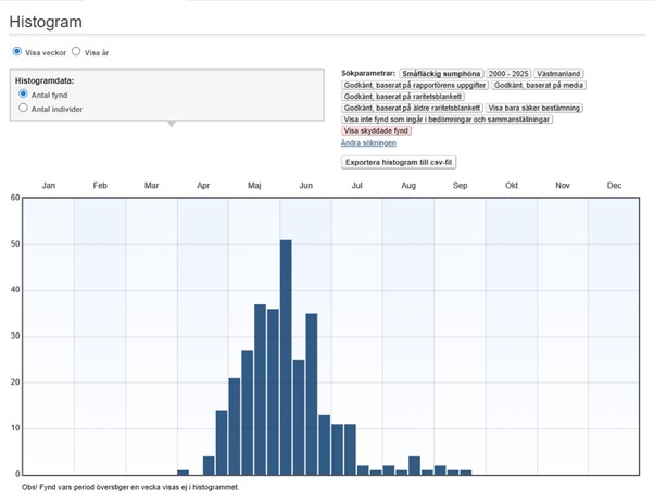 Veckovis fördelning av fynd av småfläckig sumphöna i Västmanland 2000-2025.