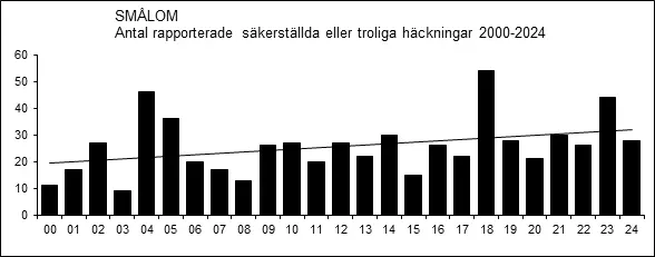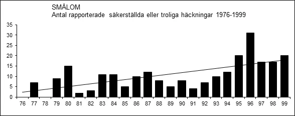 Figuren nedan antyder en kraftig ökning framför allt under 1990-talet. Denna ökning torde dock till största delen vara skenbar och förklaras med ett ökat eftersök av arten.