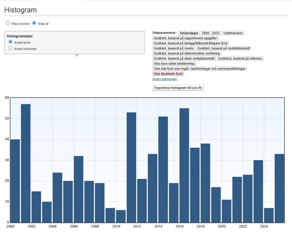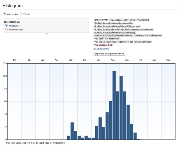 Mediandatum för första och sista vårobservation under perioden 1976-2025 är den 18 maj respektive den 22 maj. Mediandatum för första och sista höstfynd under samma period är den 20 juli respektive den 21 september.