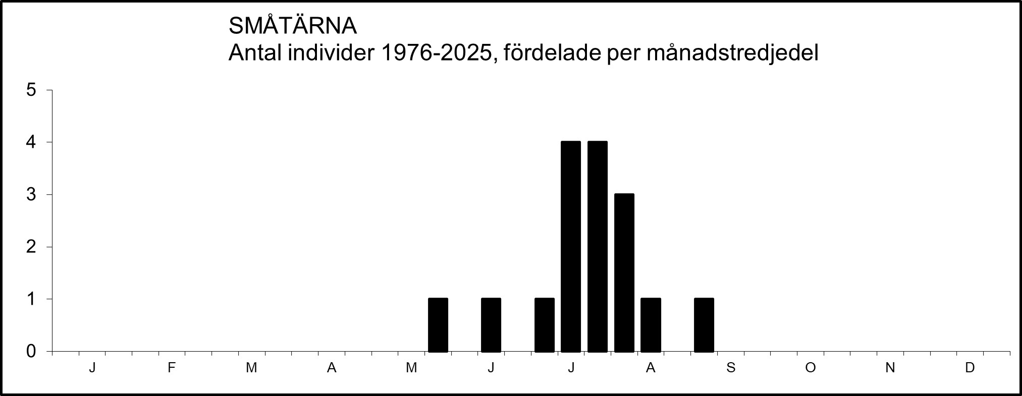 Småtärnan har påträffats 14 gånger (17 ex.), varav 5 gånger (7 ex.) under perioden 2000-2025. Flertalet fynd har gjorts under sensommaren. Förteckning över fynden: