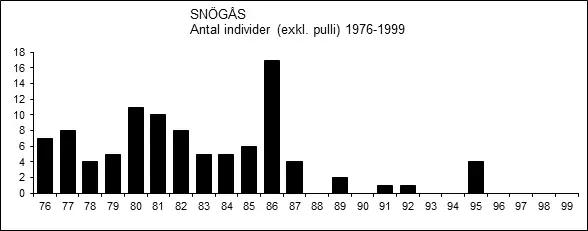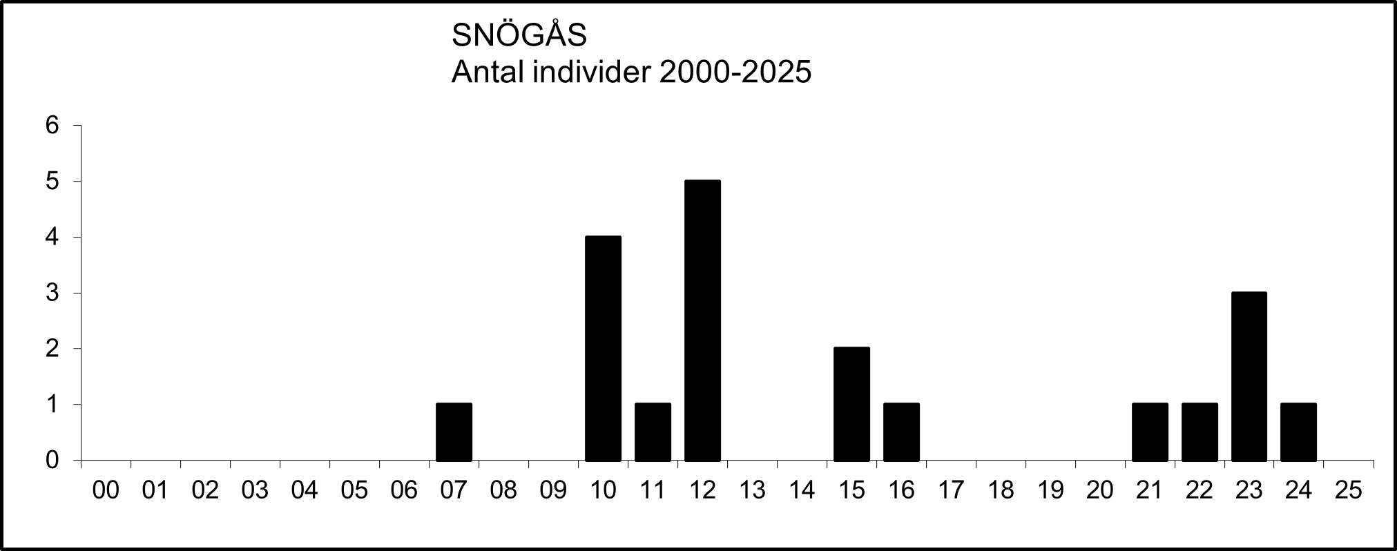 Samtliga fynd av snögås i Västmanland bedöms som icke spontana. Ursprunget till två ”färgmärkta” fåglar vid Gussjön i Fläckebo 6-11 april 1985 (FiV 17:58) är inte känt.
