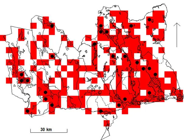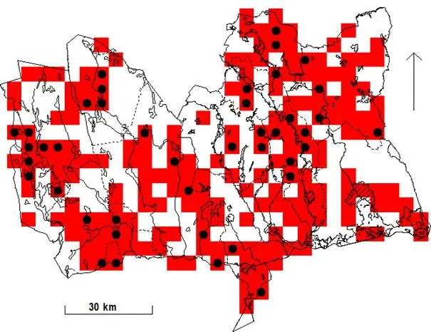 Rutor (5×5 km) med fynd under häckningstid 1974-1984. Svart prick anger ruta med säkerställd häckning.