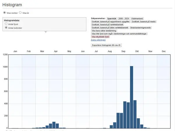 Veckovis fördelning av sparvhökar 2000-2024 som har rapporterats som sträckande.