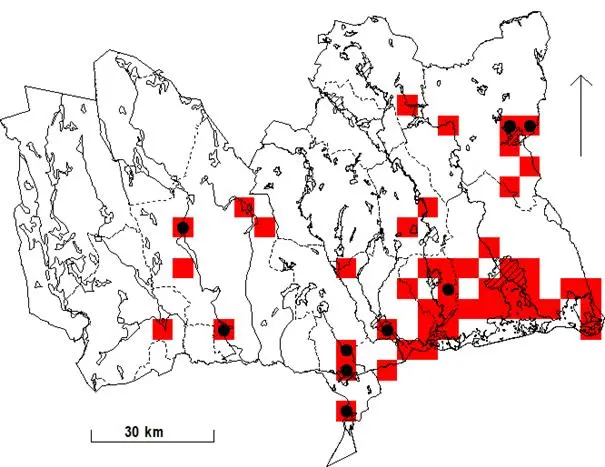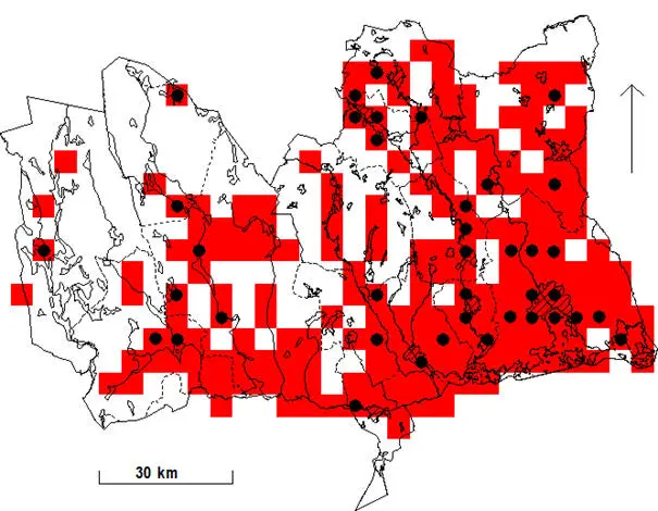 Figuren nedan visar steglitsens utvidgning av sitt utbredningsområde i Västmanland och därmed ökning av populationsstorleken sedan millennieskiftet.