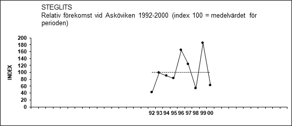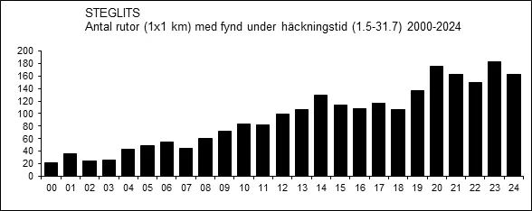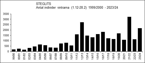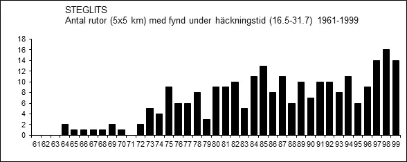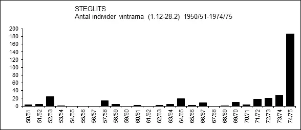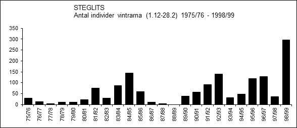 Under perioden 1976-1999 rapporterades som mest 296 steglitser vintern 1998/99.