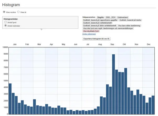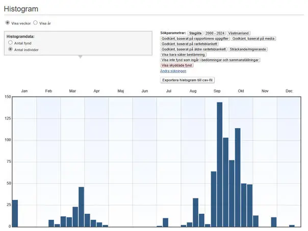 De högsta (minst 25 ex.) dagssummorna av sträckande fåglar 2000-2024: