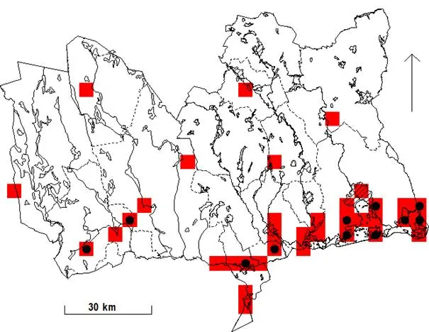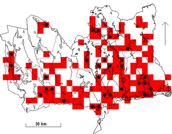 1969 ”Tycks ej vara sällsynt längs Mälarens stränder. Dessutom iakttagen i Västerfärnebo, Ramnäs och Grönbo, Ramsbergs sn.” (Ingvar Granqvist 1970b).